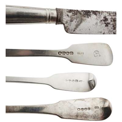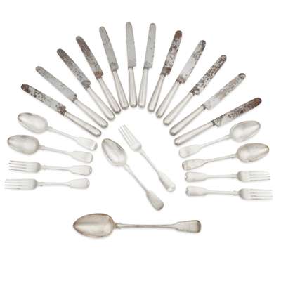 London, various dates and makers, comprising, a basting spoon, of Fiddle and Thread pattern, five table forks, five tablespoons; together with twelve silver handled steel bladed table knives by Richards
