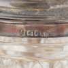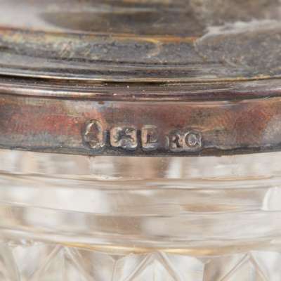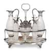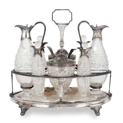 Richard Cook, London 1800, of oval form, with a central angular handle, the frame for four small, two large glass bottles, and two oval glass jars and lids, all silver mounted, beaded frame, plain mirror base and all raised on clasped bracket feet