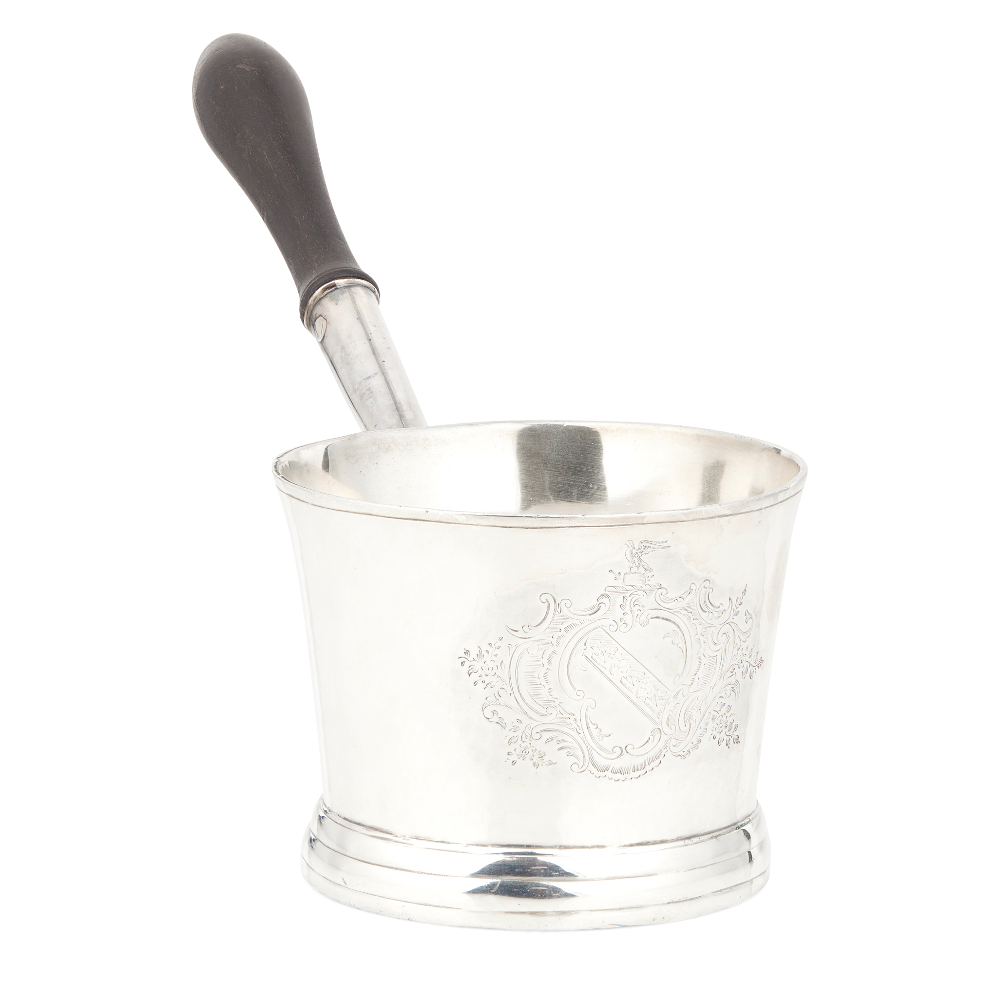 London 1751, the body of slightly tapered form, with an engraved cartouche and crest to centre, the wooden handle of baluster form, raised on a stepped foot