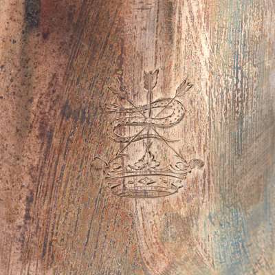 RB, London circa 1725, of tapering form, the domed hinged lid with a knopped ball finial, S-scroll wooden handle, raised on a slightly stepped circular foot, engraved 'SH/to/SG' to the underside
