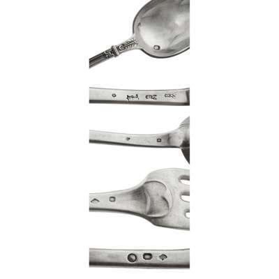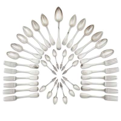 various marks, comprising a basting spoon, twelve table forks, twelve tablespoons, all of variant Fiddle Pattern, some with engraved initials; together with a collection twelve coffee spoons, Alphonse Debain, with stylised stems and coronet finials