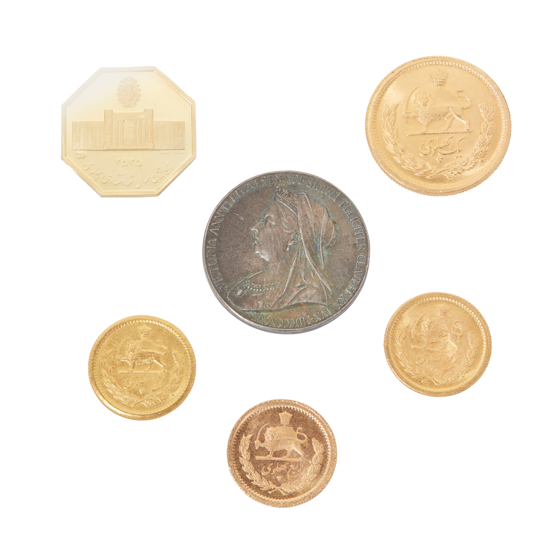 to include, an Iranian ½ Pahlavi and three ¼ Pahlavi; together with an octagonal medal, commemorating the 50th anniversary of Bank Melli, the National bank of Iran, the reverse featuring Bank Melli and a Victorian Diamond Jubilee Silver Medal