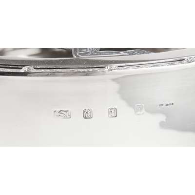 Irish Silver Ltd., Dublin 1976, the hemispherical bowl with a Celtic knot-work border, engraved to the body, 'THE JUBILEE CELTIC BOWL PRESENTED BY MR AND MRS GRIFFITH' the S-scroll handles each modelled as a sea serpent, to a short stem, the pull-off lid with pierced Celtic beast motifs, the plinth with applied plaque, engraved with recipients including Fiona Hyslop MSP, Susan Boyle etc. (2)