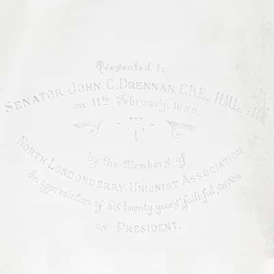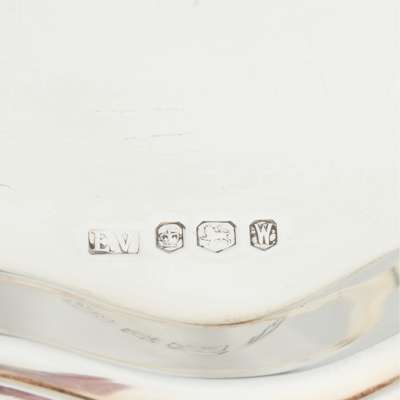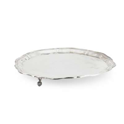 Viner's Ltd, Sheffield 1964, with a pie crust border, engraved presentation inscription to centre ‘1966’, raised on three leaf clasped ball feet