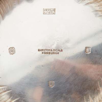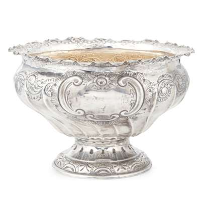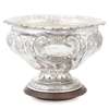 Hamilton & Inches, Edinburgh 1909, the bowl of sweeping fluted form, chased floral and foliate border with a chased vacant cartouche, the everted rim with similar decoration, raised on a domed foot with similar floral chased decoration; together with a later associated cut glass fruit bowl and wooden plinth