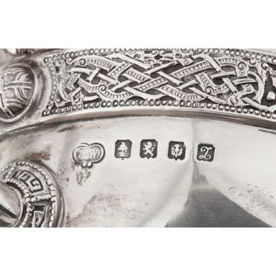 James Weir, Glasgow 1908, comprising waterpot, teapot, twin handled sugar basin and milk jug, each of circular outline, waisted border with zoomorphic and Celtic knotwork, vacant circular cartouche to one side and embossed knotwork to the other, C scroll handles, the sugar and milk handles modelled as a mythical creature, raised on a circular foot with similar border