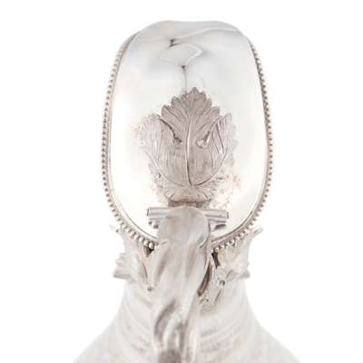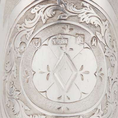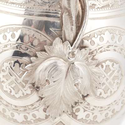 William Marshall, Edinburgh 1866, of slender baluster outline, all-over chased scroll decoration to a matte background, the vine handle with ivory inserts and cast vine leaf terminals, raised on a circular foot with beaded border and similar chased decoration