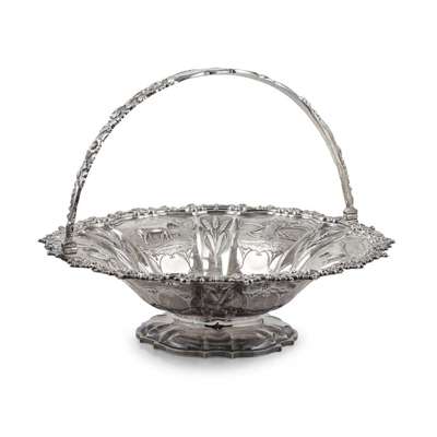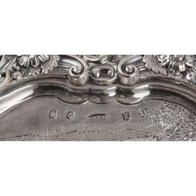Mackay, Cunningham & Co., Edinburgh 1829, of circular outline with a cast shell and floral border, the raised edge with embossed panels depicting arable and pastoral farming scenes, raised on a short stem with a moulded foot, the swing handed with a floral motif and vacant cartouche to centre