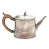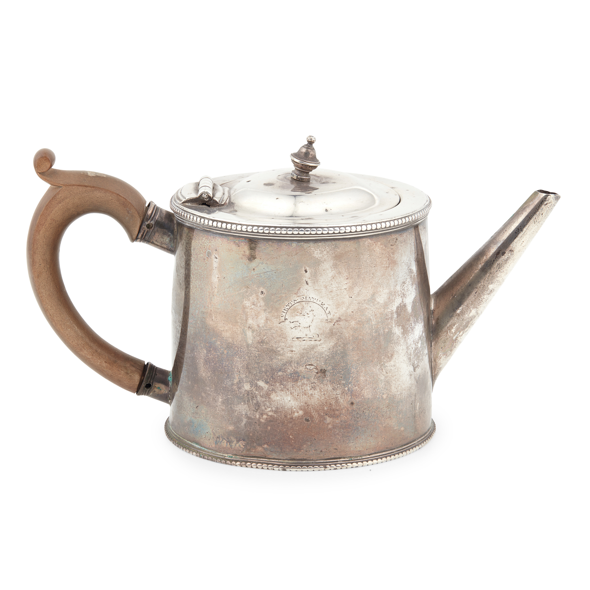 Patrick Robertson, Edinburgh 1777, of traditional drum outline, crest and motto engraved to body with beaded borders, C-scroll wooden handle, straight spout, the hinged lid with a knopped finial