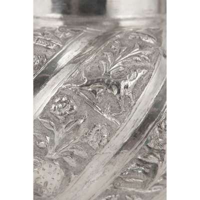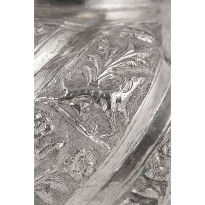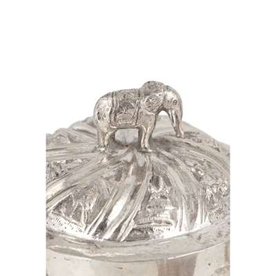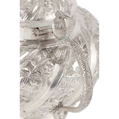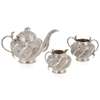 unmarked, comprising a teapot, twin-handled sugar basin and a milk jug, all spherical form, sweeping panels chased with Indian animals, including tigers, elephants, leopard etc, the handles modelled as coiled snakes, and the finial to the hinged lid of the teapot pot modelled as an elephant, all raised on a circular foot (3)