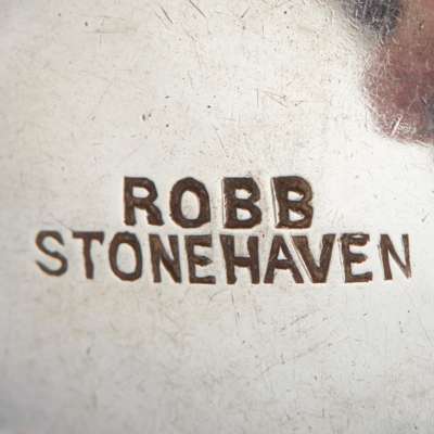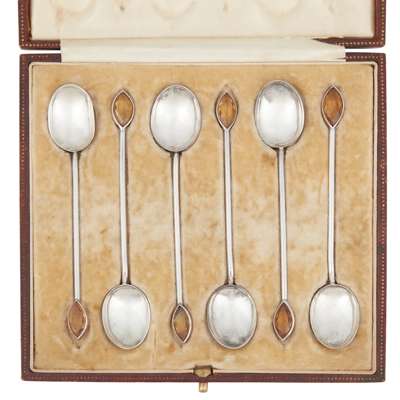 marked ROBB / STONEHAVEN, each collet set with a marquise-shaped citrine to finial, straight stem, small bowl, in fitted box for James Robb... Bolton/ Glasgow Exhibition 1911