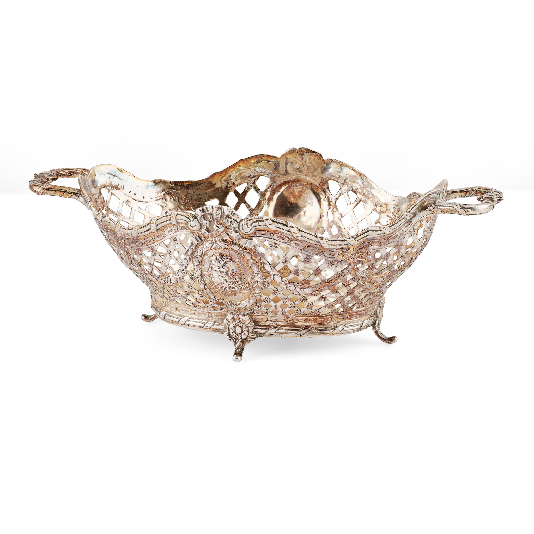 of oval outline, the pierced sides set with an oval cartouche with noble figure, raised on four floral feet