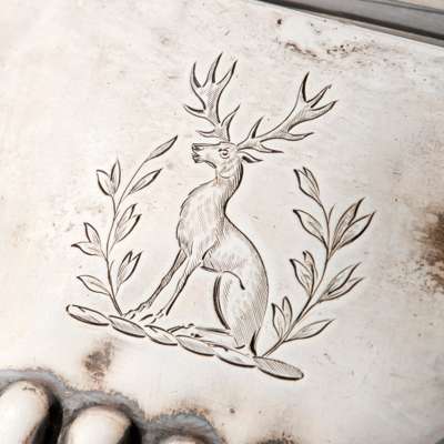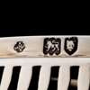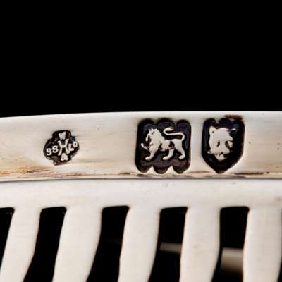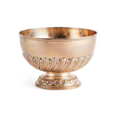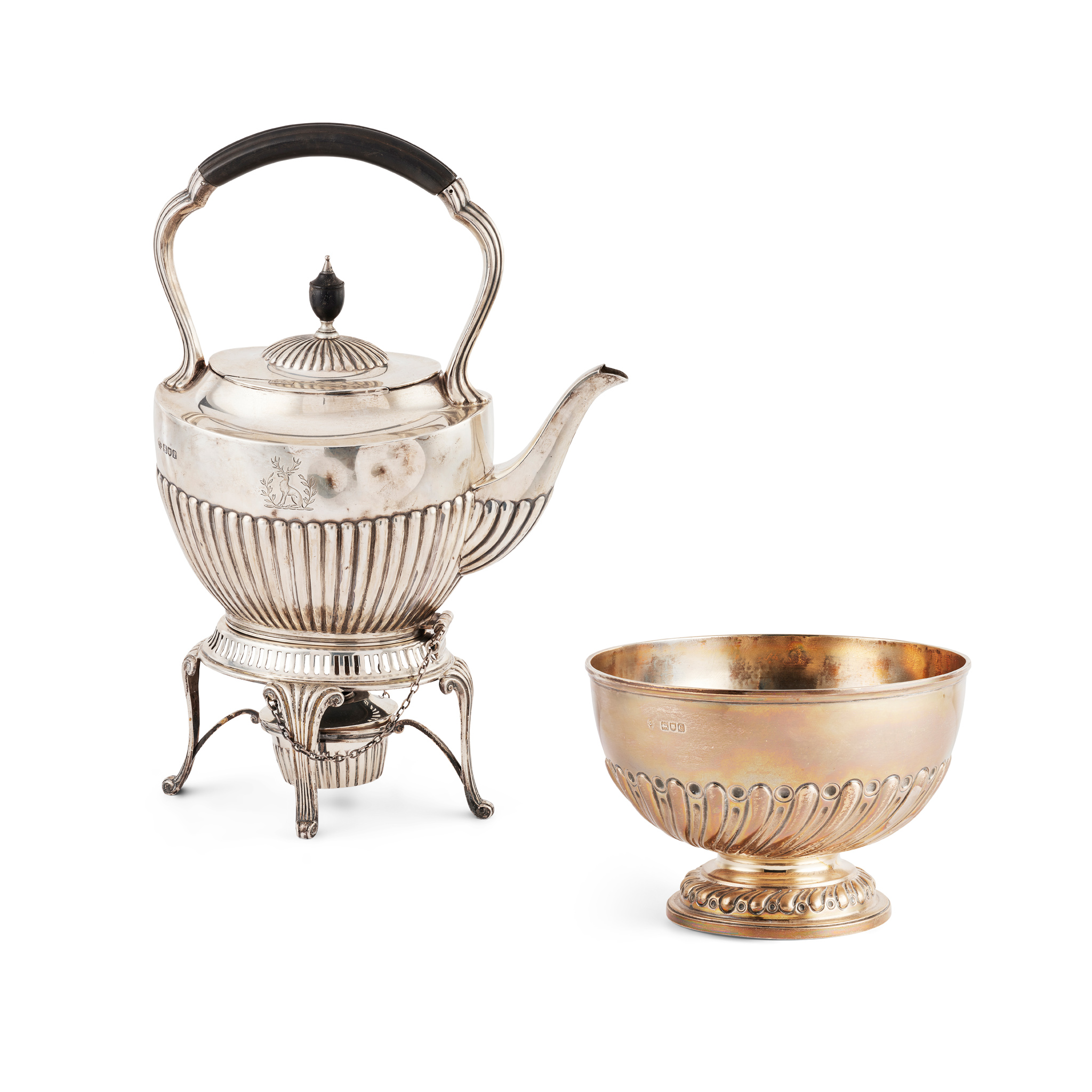of oval outline with demi-fluted body, engraved crest to upper part, urn finial to the hinged lid, the stand of oval pierced design, raised on four fluted ionic style legs, with keys and burner; together with a rose bowl, Charles Stuart Harris, London 1898, of demi-fluted hemi-spherical form, raised on a domed foot with similar decoration (2)