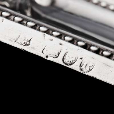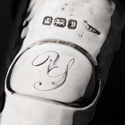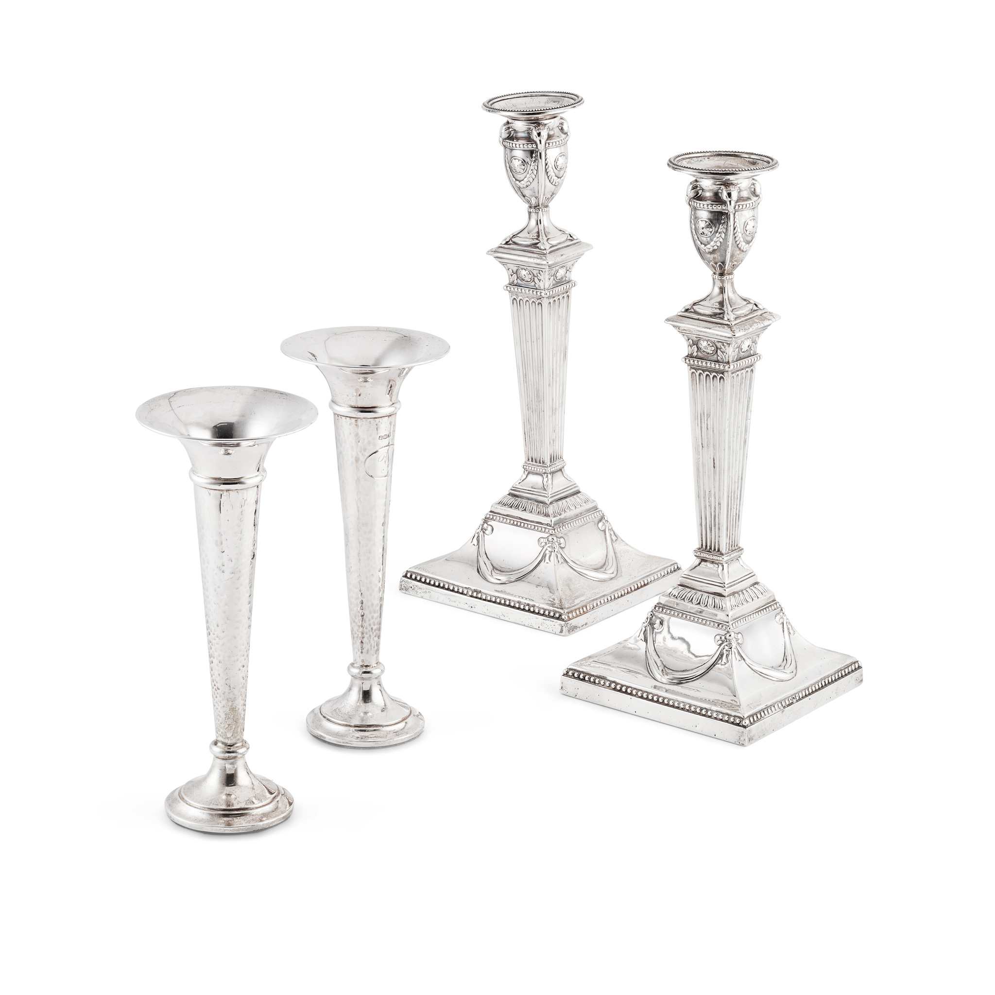 the tapered Corinthian column to square bases with swag detail, the drip pans of urn form with similar swag decoration (loaded); together with a graduated pair of spill vases, Walker & Hall, Sheffield 1911, of tapered planished form, engraved Y to oval cartouche (loaded) (4)