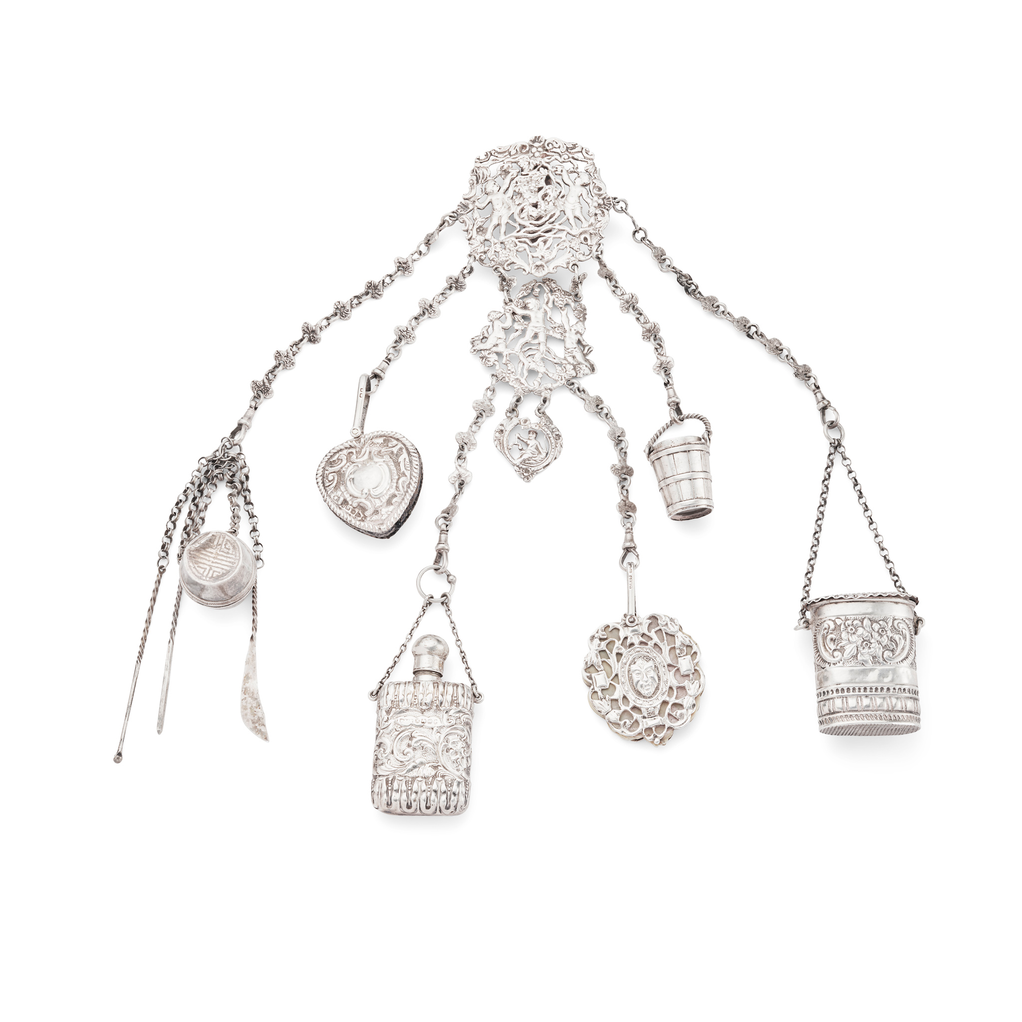 the pierced clip with twin cherubs and classical swags, suspending a thimble in bucket, a vesta case, a flask, etc., various makers