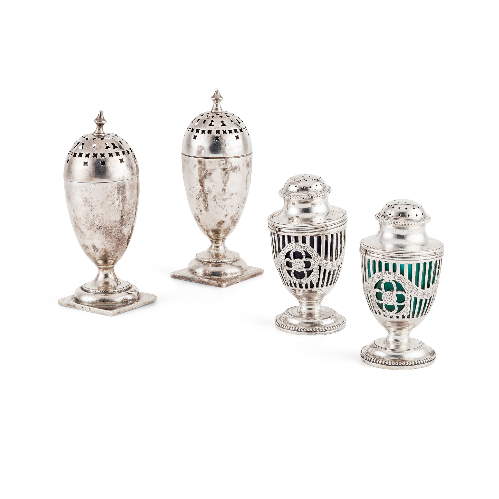 of tapered oval form, pierced pull-off lids, raised on square bases; together with another pair, C.S. Harris, London 1904, of pierced vase form, with green and blue glass liners (4)