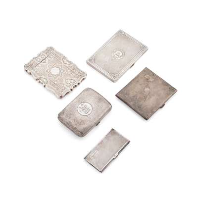 comprising four card cases, one engraved with the crest and motto ‘PREND MOI TEL QUE JE SUIS’; together with a stamp case (5)