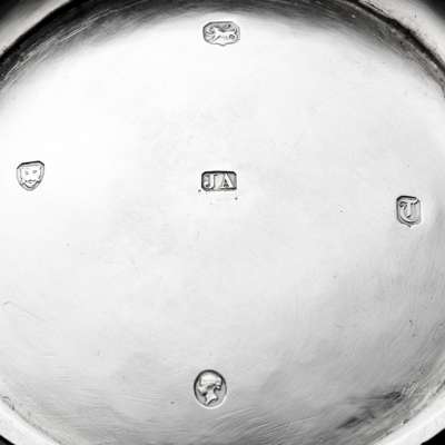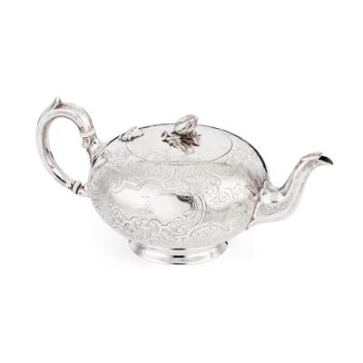 of squat spherical form, engraved scroll decoration throughout, crest engraved to cartouche of one side. the C-scroll handle with ivory insulators, the hinged lid set with a budding finial, raised on a circular foot