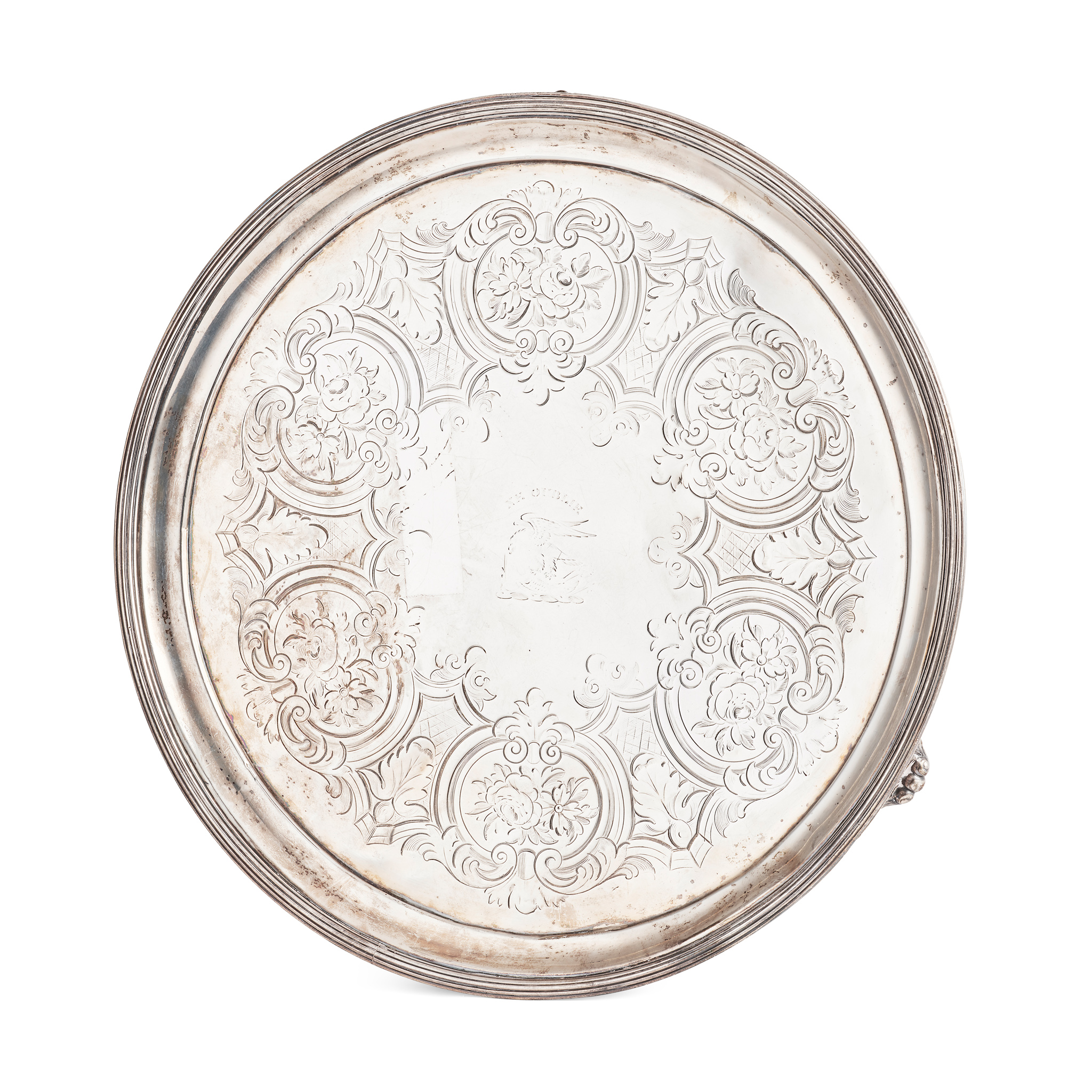 of circular outline, raised rim with threaded border, the dish with engraved floral scroll motifs, engraved crest and motto to centre for Clan Graham, raised on three shell bracket feet