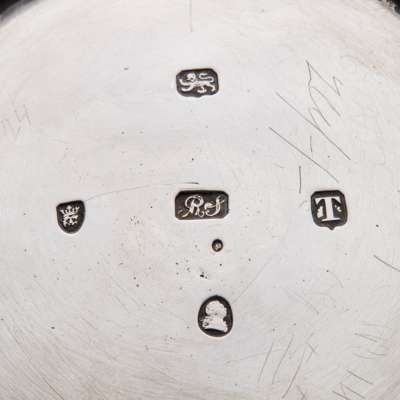 of squat baluster outline, Classical floral wave border to waist, with chased foliate border below the neck, beaded border to the everted rim of spout, C-scroll handle, raised on a circular foot