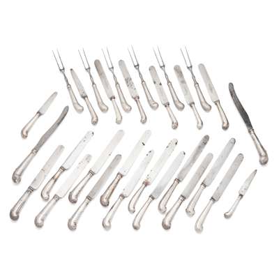 A GROUP OF EARLY 19TH CENTURY SILVER HANDLED KNIVES AND FORKS