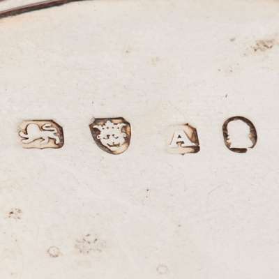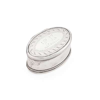 of oval outline, engraved double crest within border of hinged lid, compartment to base