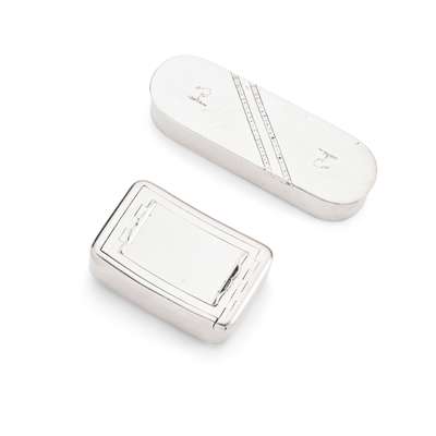 of elliptical outline, the hinged lids each engraved with the same crest, to a gilt interior; together with another Thomas Phipps, Edward Robinson & James Phipps, London 1811, of rounded rectangular outline, the hinged lid opening to a main compartment with a smaller compartment within (2)