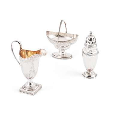 of oval outline, bright-cut engraved decoration, engraved initials to one side of body, raised on an oval foot; together with a helmet jug, John Round & Son Ltd, Sheffield 1900 and a caster, Zachariah Barraclough & Sons, Chester 1932, of panelled baluster form (3)