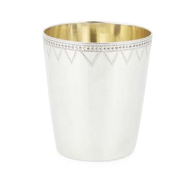 of tapered form, Bright-cut engraved border and mermaid crest to body, with gilt interior