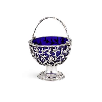 the deep wire work basket with applied floral, foliate and bow designs, with gadrooned border and on simple spreading foot with embossed and pierced detail, the twisted swing handle with floral motifs, with blue glass liner