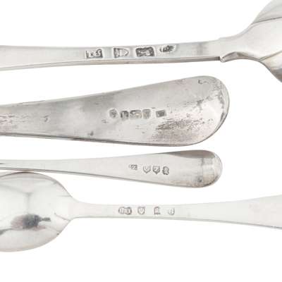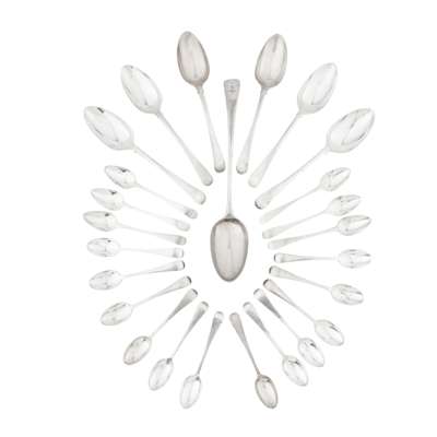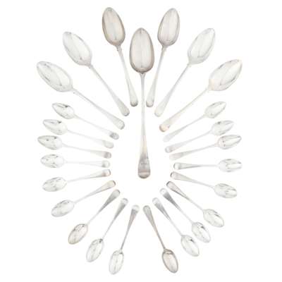 of Old English with shoulders pattern, engraved C to terminal; together with a serving spoon, 1785, of Old English pattern, engraved crest to terminal, a collection of teaspoons, including twelve, Hamilton & Inches, Edinburgh 1894 and six others (25)