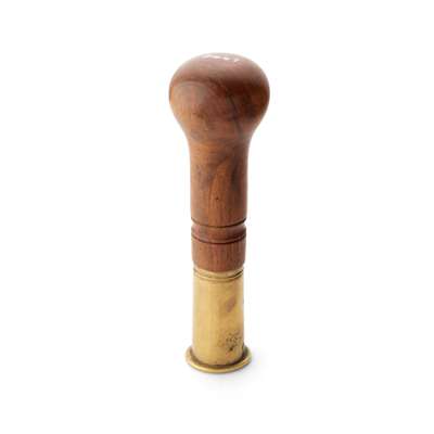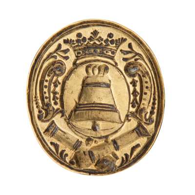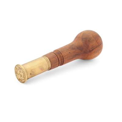 the baluster wooden handle to a brass collar and oval seal matrix engraved with a bell surmounted by a Ducal coronet, in a border of scroll work and crossed cannons