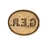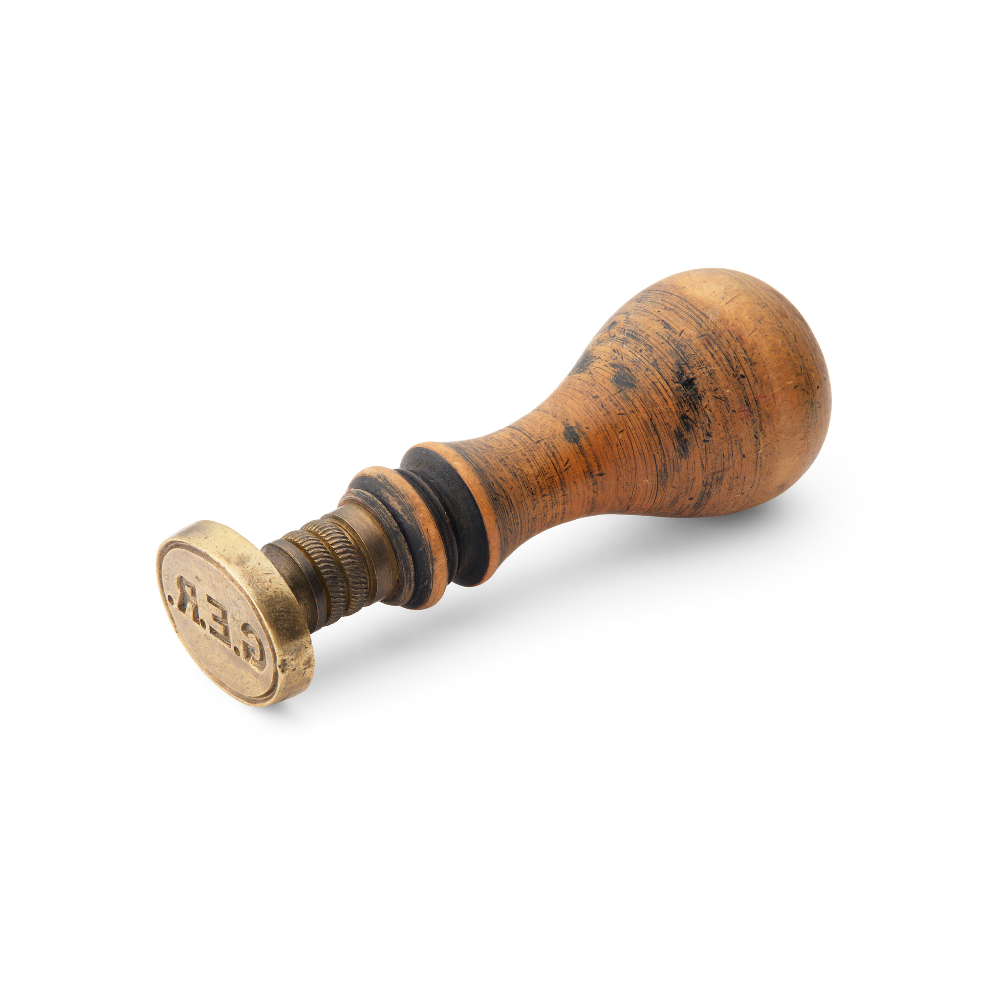 the handle of turned form with a flat top terminal, to a brass collar with double rope-twist border, the oval matrix engraved G.E.R.