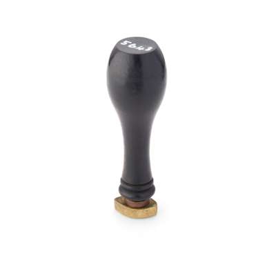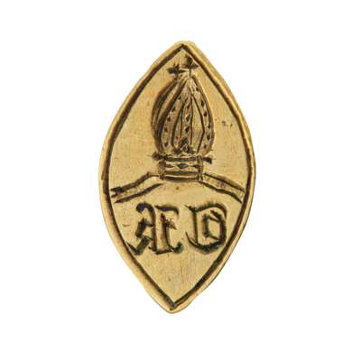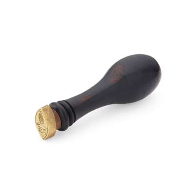 the baluster wooden handle with double knopped collar, to a brass matrix of navette outline, engraved with a bishop's mitre and engraved initials