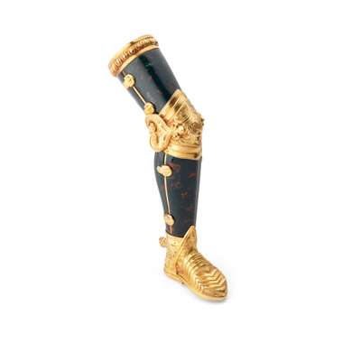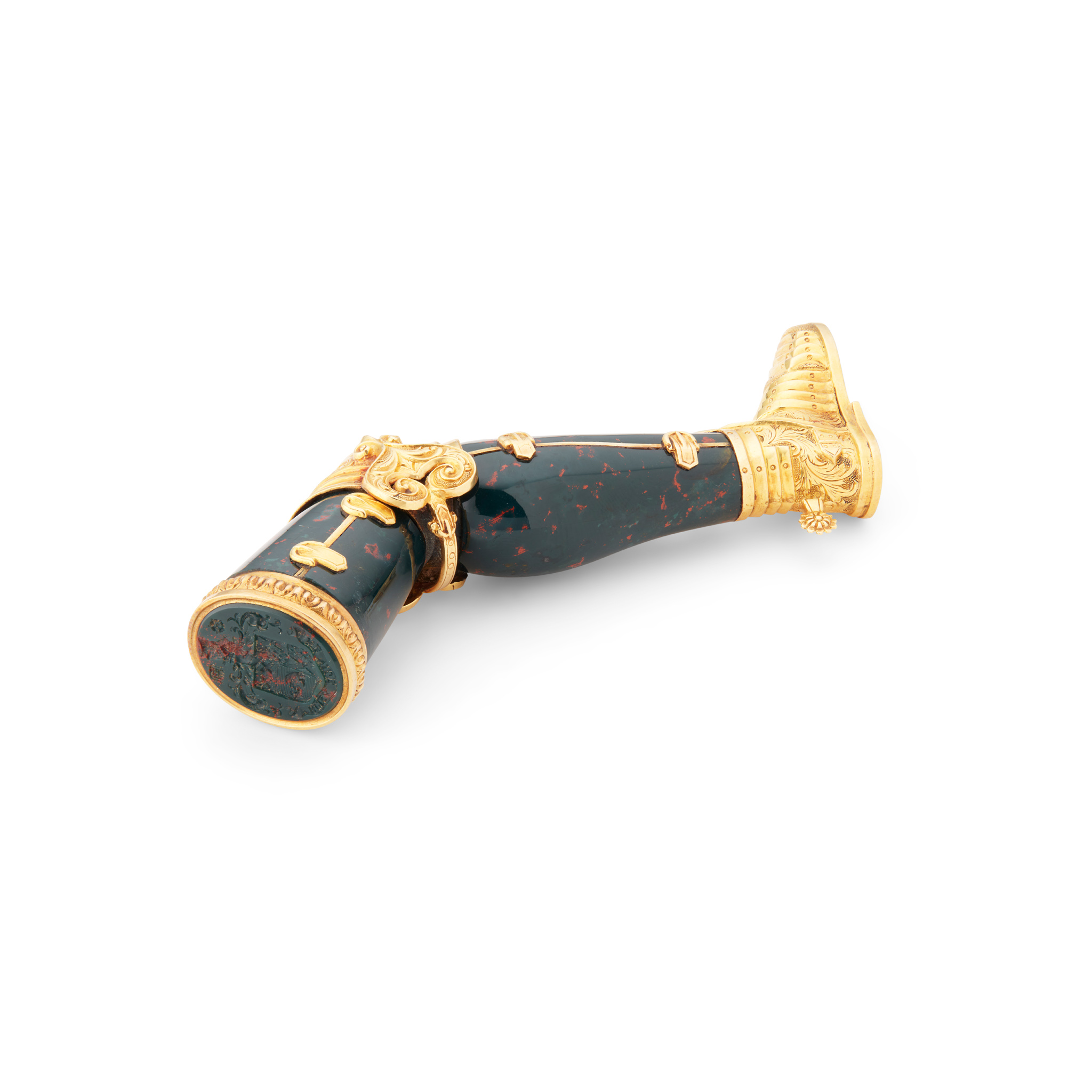 modelled as an armoured leg, the oval bloodstone terminal engraved with the armorial, rose and portcullis, the bloodstone heel engraved with motto NE VILE VELIS, rose and portcullis