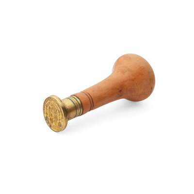A 19TH CENTURY TURNED FRUIT WOOD AND BRASS DESK SEAL