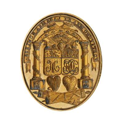 the turned wooden handle with domed mushroom terminal, to a brass collar and oval shaped matrix engraved with the bible passage 'FORTITUDO MEA ET LAUS MEA DOMINUS' with various swag covered columns, scrolls, hearts, cornucopia etc