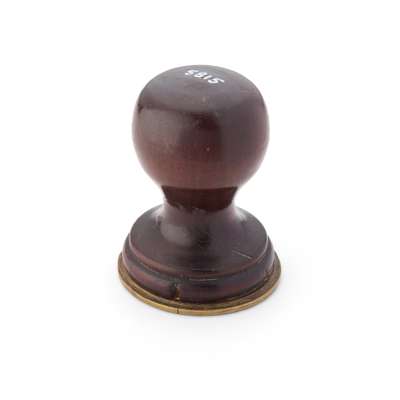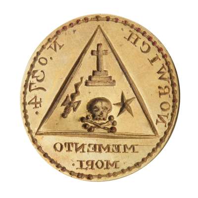 the domed wooden handle to a brass matrix engraved ‘No 374 NORWICH MOMENTO MORI’ with masonic symbols to the centre within a triangle