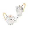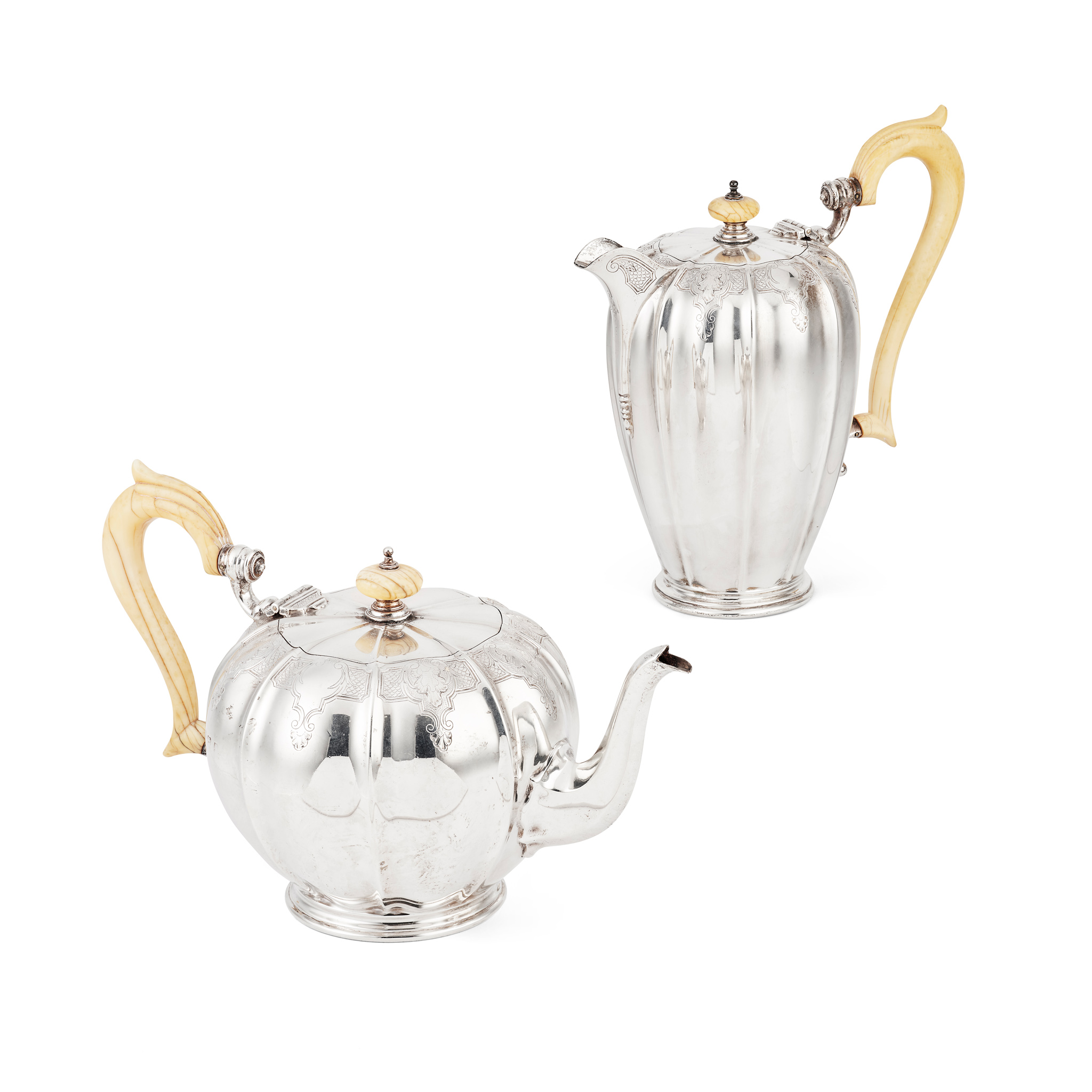 each of melon form, engraved shell and scroll border, ivory handles and finials, raised on a circular foot (2)