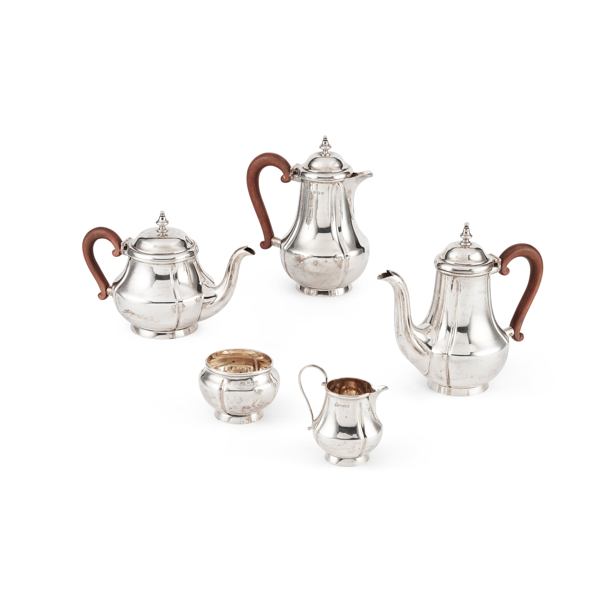 comprising a tea pot, a hot water pot, a coffee pot, a milk jug, a sugar bowl, all of panelled baluster outline, S-scroll wooden handles, raised on a circular foot (5)
