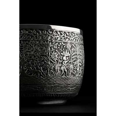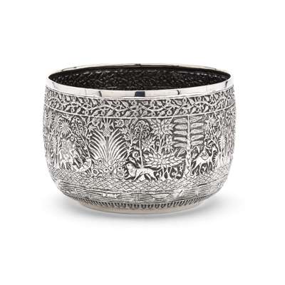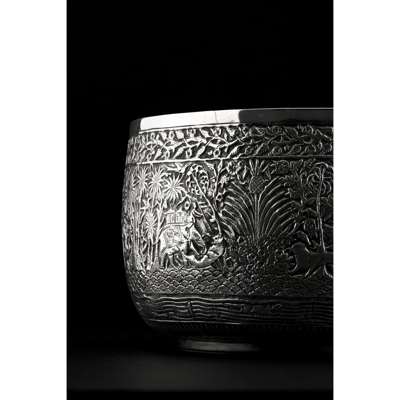 The straight sides to the bowl with heavily decorated figures in the Kutch style of jungle motifs, engraved elephant with rider signature to underside