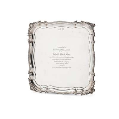Of moulded square outline, with cast shell and moulded border, engraved presentation inscription to centre, raised on four stylised hoof feet