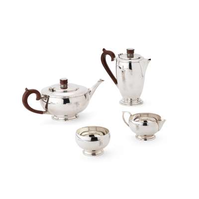 Comprising a teapot, hot water pot, sugar bowl and milk jug, all of plain design with engraved initial ‘H’ to body, wooden C-scroll handles to teapot and water pot, each raised on a circular foot (4)