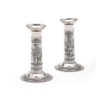 Although unmarked the decoration would suggest origin as Calcutta, classically seen with the chased decoration of lot 1 and lot 6 being among the commonly found motifs in this style, although candlesticks are surprising rare for India, they must have been a universally useful object.