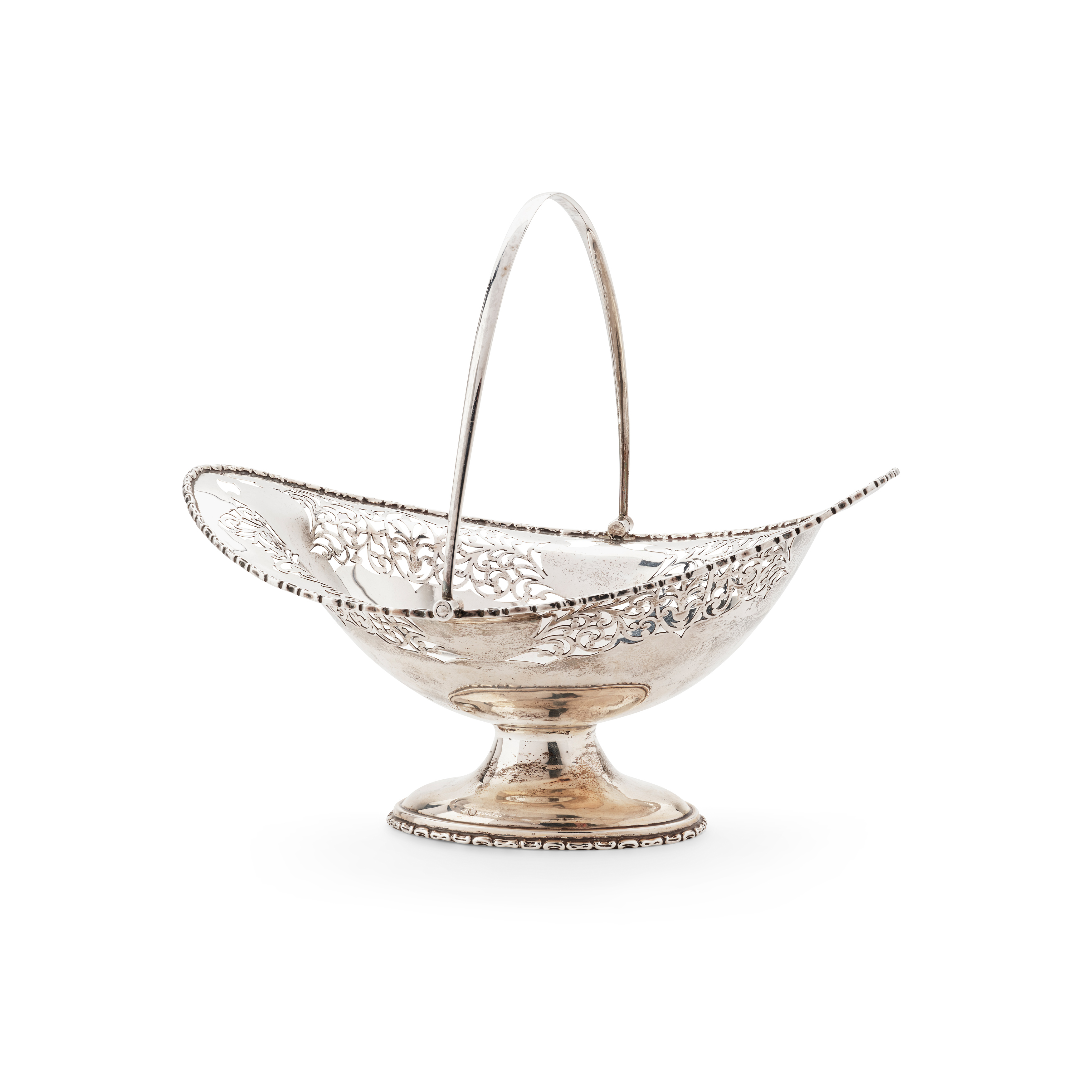 Of undulated oval outline, pierced foliate scroll border, raised on an oval foot