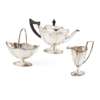 Comprising a teapot, swing-handled sugar basket and milk jug, all of lobed form with an undulating border with a threaded detail to the sugar basket and milk jug, raised on an oval foot, with angular handles to the jug and teapot (3)