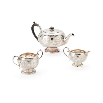 Comprising a teapot, twin-handled sugar basin and a milk jug, all of spherical form, engraved scroll decoration throughout, engraved S to the oval cartouche, S-scroll handles, each raised on a domed circular foot (3)