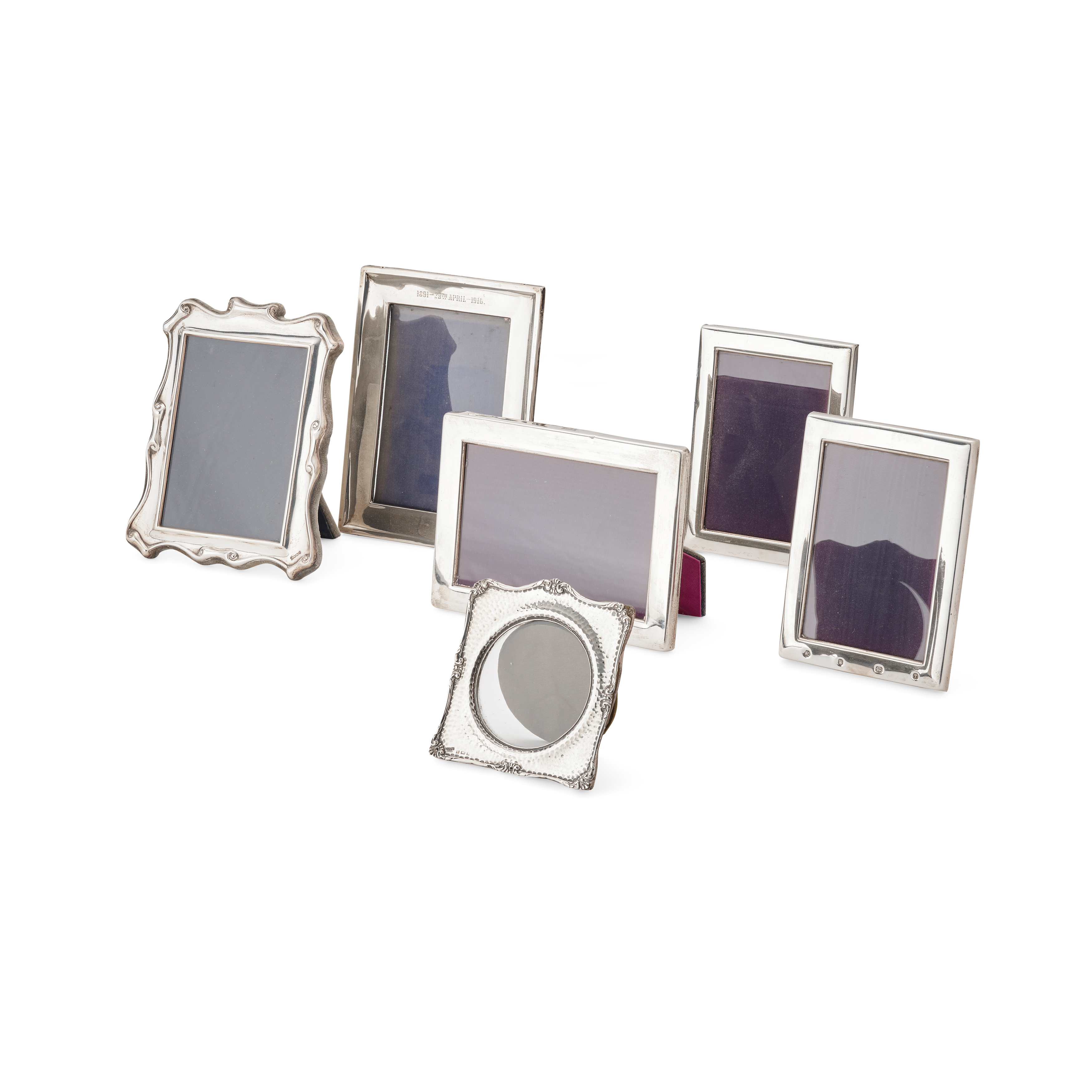 Four of rectangular outline, one with feature hallmarks and one with presentation engraving; together with a moulded rectangular example and a smaller moulded square example of hammered finish with shell detail to borders (6)