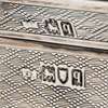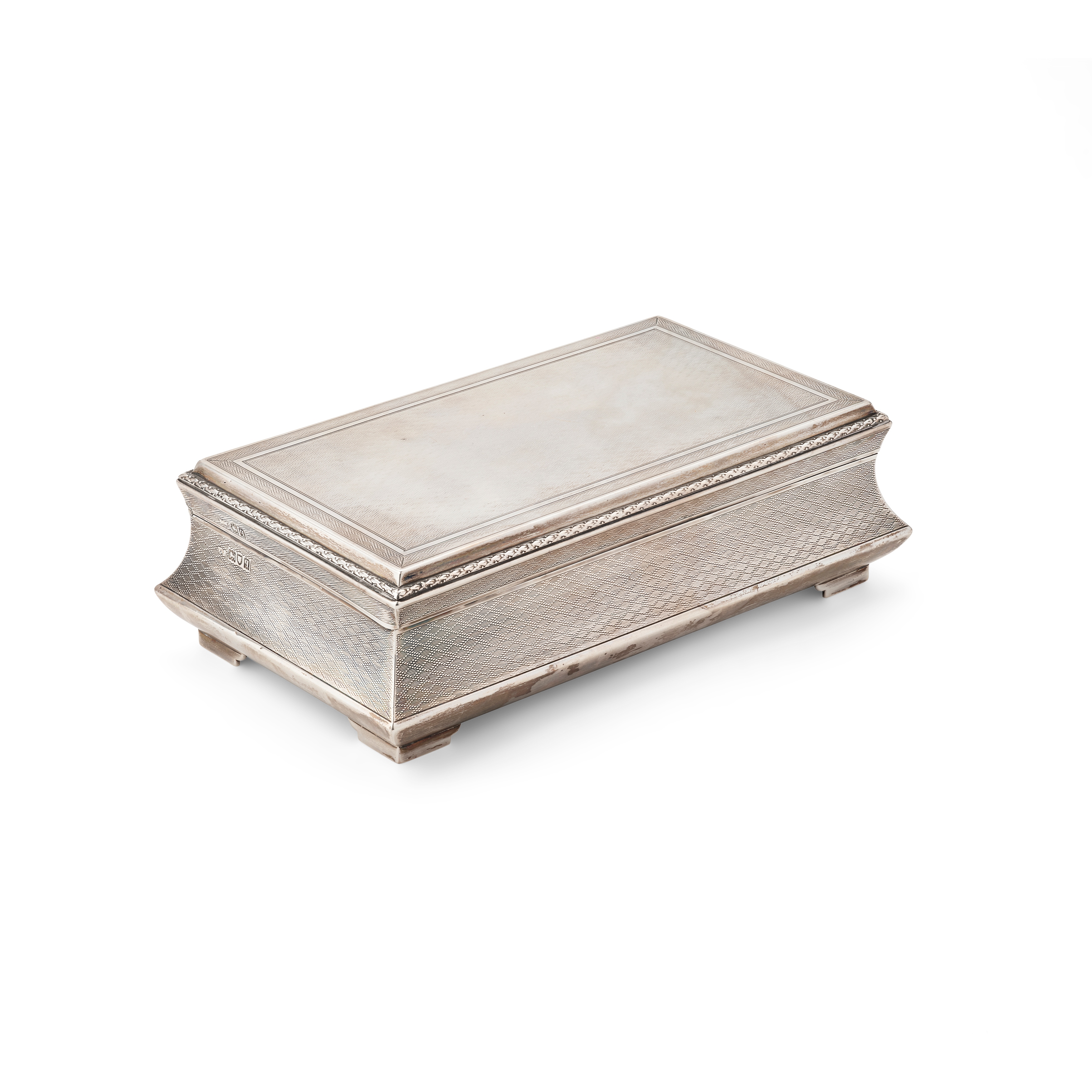 Of rectangular outline with concave sides, engine-turned decoration throughout, floral border to hinged lid, raised on four bracket feet, to a wooden lined interior with two compartments