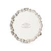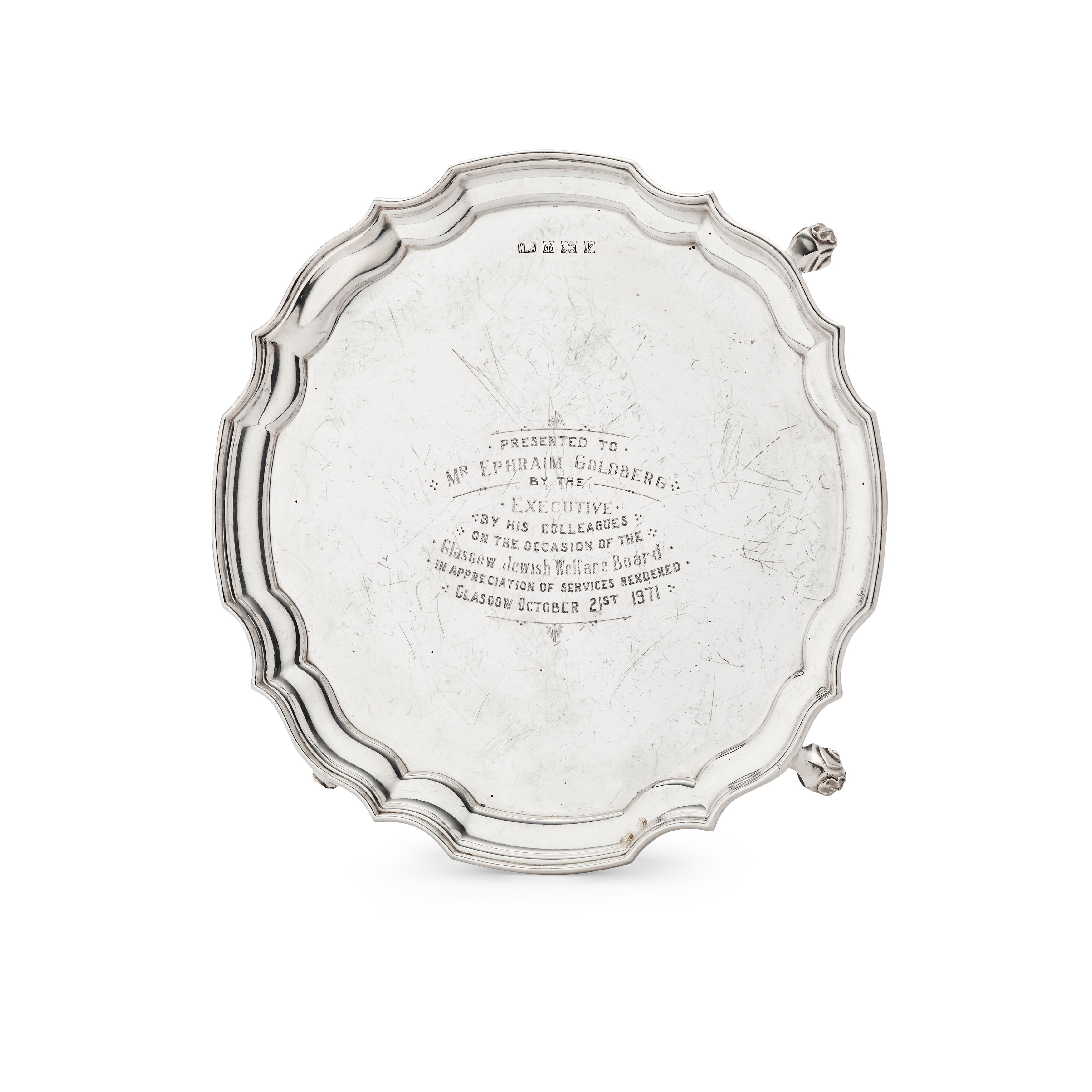 Retailed by Jas Dwerryhouse of Liverpool, of circular outline with a pie-crust border, engraved presentation inscriptions to the centre, raised on three ball and scroll feet; together with another smaller similar, William Adams Ltd., Birmingham 1970, with presentation inscription to the centre (2)